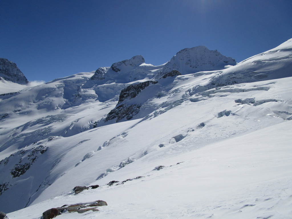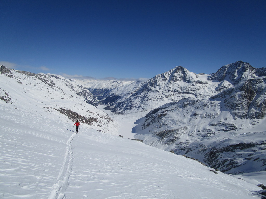 Vybrali sme sa hore svahom popod Chaputschin traverzujúc úbočia mierne vľavo. Ponad zrázy siahajúce až ku ľadovcu sme sa dostali na rampu ktorá je zo spodnej časti ohraničená ľadovcom a zhora už je stena Chaputschinu. Zaujímavé miesto s úžasnými výhľadmi. Pretraverzovali sme na plochý ľadovec. Nebezpečenstvo trhlín tu bolo minimálne a tak sme sa v pohode po miernom ľadovci dostali až do Fuorcla Chaputschin. Odtiaľto sú výborné výhľady do Val Fex ale vidieť oveľa viac...