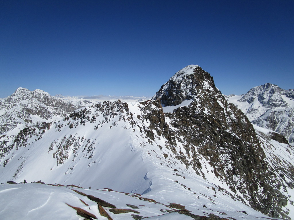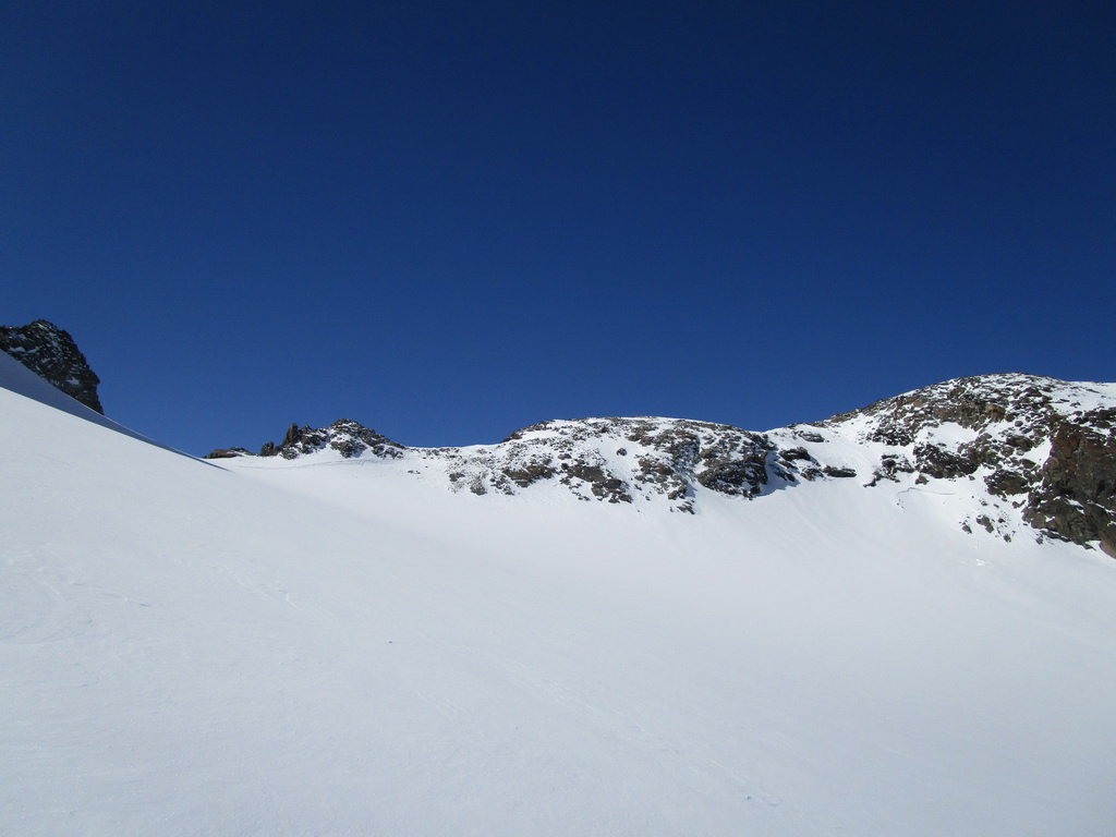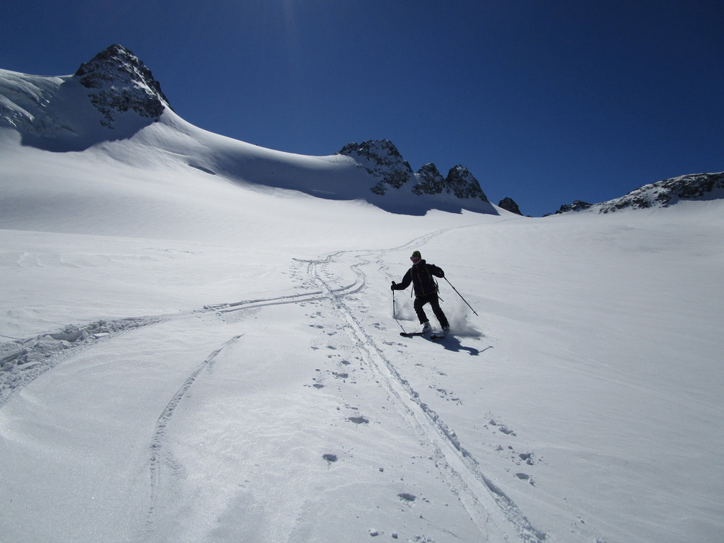 Po hrebeni s výhľadmi všade naokolo sme postupovali smerom ku vrcholu Chaputschin. Otočili sme sa na kopčeku s ešte značným odstupom od vrchola. Čakal na nás parádny zjazd prašanom ale aj kôrkou od vetra naspäť ku chate. V ten deň sme sa ešte museli presunúť dole do doliny ku hotelu Roseggletscher.