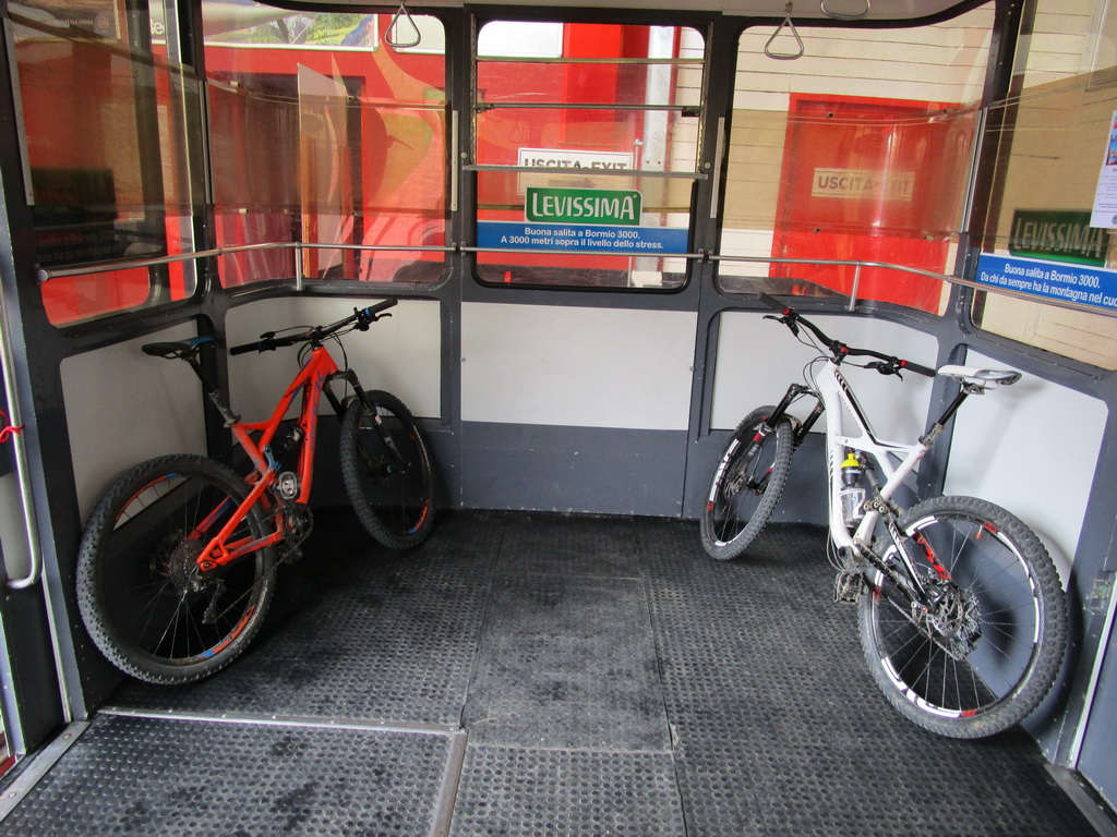 Po obedňajšej zmrzlinovej pauze sa uličkami presúvame ku stanici lanovky Bormio 3000. Máme síce v nohách veľkolepý zjazd z passo Zebrú a výšlap od chaty Pizzini ale vďaka vývozu na chatu sa náš deň ešte nekončí. Kupujeme lístky na lanovku. Cena je nižšia ako na Skalnaté pleso, prevýšenie vyššie, bicykel zdarma...V polovici prestupujeme do menšej lanovky. Sme sami, frírajderi už sú poobede unavení.
