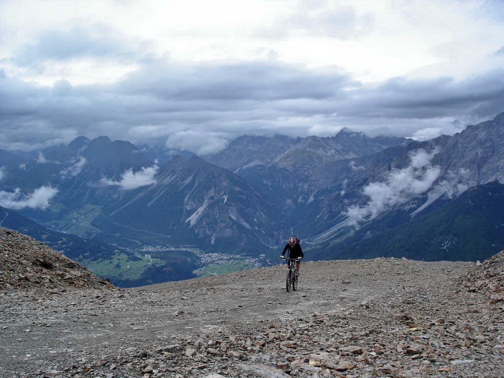 Priamo v Bormiu je lyžiarske stredisko, ktorého najvyšším bodom je vrchol Cima Bianca. Nachádza sa južne od Bormia, takže stredisko je na severných svahoch. Z mapy som skúmaním vrstevníc vydumal, že by nebolo zlé vystúpiť hore po zjazdovkách a spustiť sa dolinou na juh. Je to 1800m prevýšenia. Stúpa sa priamo z Bormia. Treba sa najprv vybrať z centra smerom na Passo Gavia a odbočiť doprava smerom na Bormio 2000. Je to jednoduché, lebo kopčisko je to poriadny a treba ísť furt len hore. Výšľap sa vo výške 2000m.n.m. premení z asfaltového na šotolinový priamo po zjazdovkách a je väčšinou veľmi prudký. Na najľahší prevod, špičku sedla do zadku a pokorne sa trápiť. Na vrchole je horná stanica lanovky s reštauráciou a výbornou kávičkou. Mali sme tam 6st. C a mrholenie striedala oblačnosť.