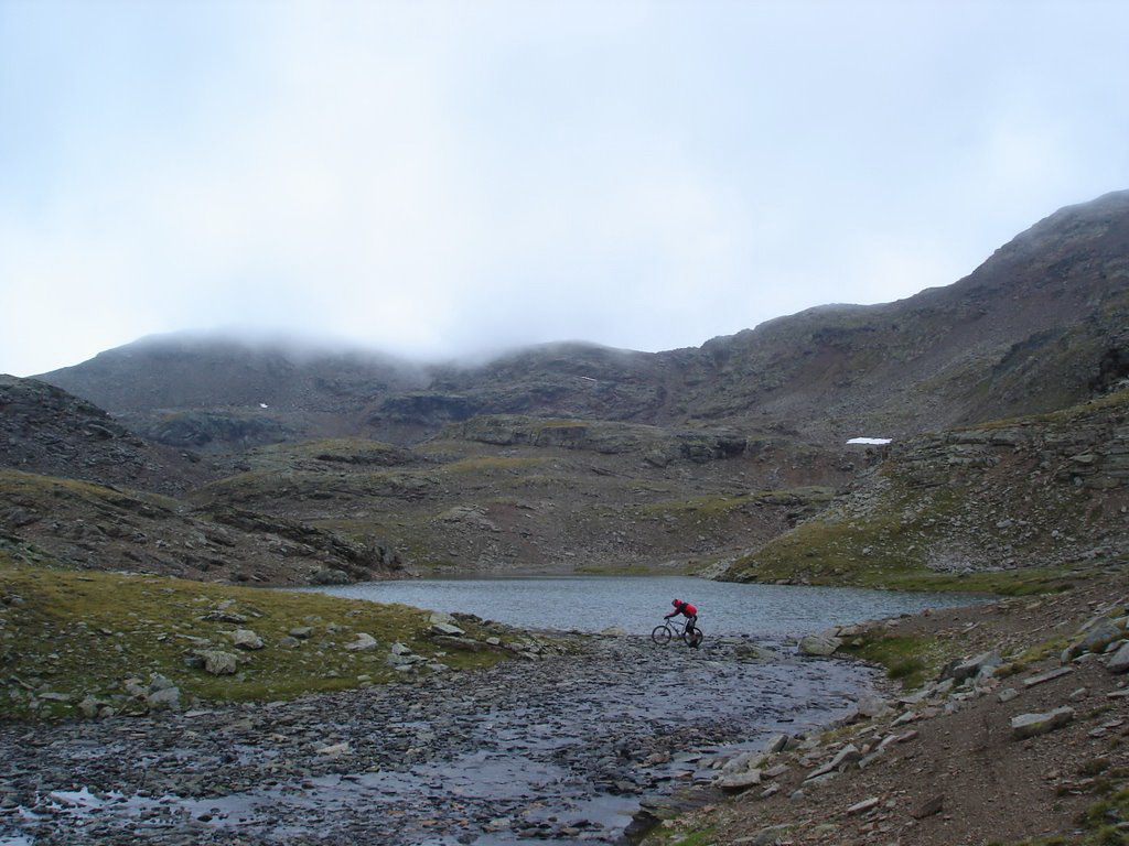 Zjazd vedie po kamenistom chodníku k plesám. Táto časť nie je s výnimkou zlomov serpentín extra technicky náročná. Pri plesách Bei Laghetti 2715m.n.m. sa odbočí doľava a začína pásmo alpských lúk. Technická náročnosť ostáva zachovaná a drží si slušný štandard. Stretávame voľne sa pasúce kone. Priamo dolu v doline nad lesom je vidieť nejakú maštaľku vidno, že odtiaľ začína už aj hladká šotolina. Nejdeme tam, lebo hladká šotolina je málo technicky náročná a pre zjazd vyhľadávam radšej náročnejšie povrchy. Púšťame sa teda do traverzu hrebeňa, ktorý uzatvára dolinu zprava (pri pohľade dolu dolinou). Túto variantu opäť čítame z mapy bez akéhokoľvek slovného popisu. Pretraverzujeme dve malé rebrá po technicky dosť náročnom, trávnato balvanovitom hore-dole povrchu a chodník začína klesať šikmo svahom ponad dedinku Santa Caterina Valfurva. Týmto svahom vedie viac turistických značiek, v ktorých nie je také ľahké sa zorientovať a zistiť, kde presne na mape práve sme. Naša trasa pretla zjazdovku vedúcu dole do dediny a vyústila na serpentínach nad Santa Caterina Valfurva vedúcich na Passo Gavia. Tento záverečný úsek lesom od spomínaných rebier až dokonca je z celého zjazdu najnáročnejší a je technicky naozaj veľmi náročný. Sú tam balvany, hlina, korene, potoky polmetrové schody a veľmi strmé padáky, ktoré sú navyše strmými traverzami. My sme to mali navyše mokré. Dá sa to však všetko v sedle.