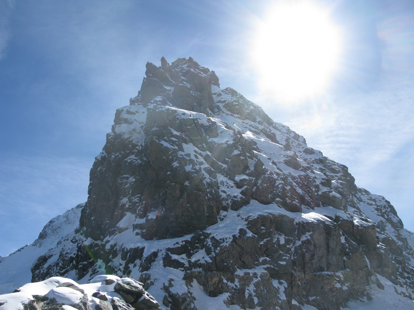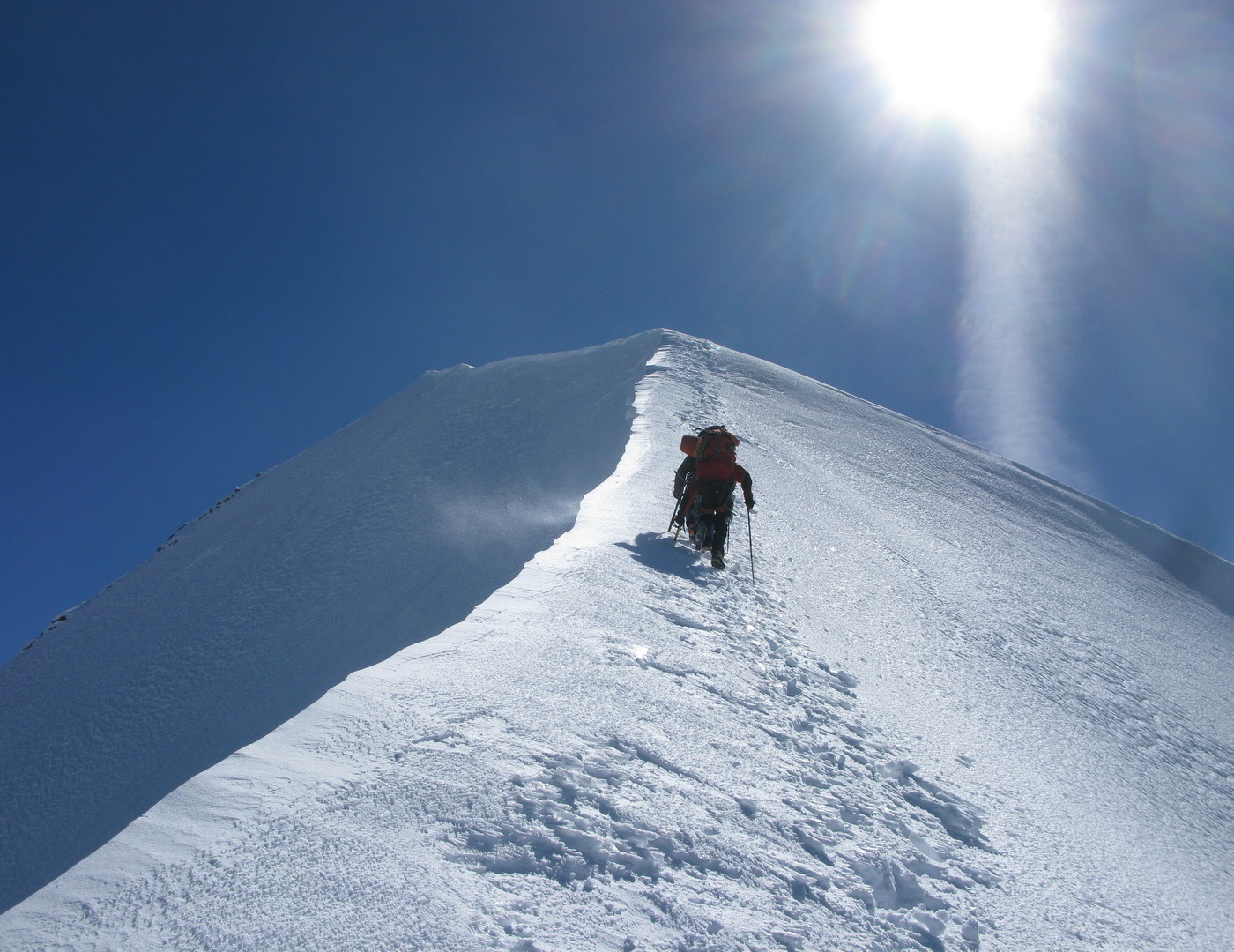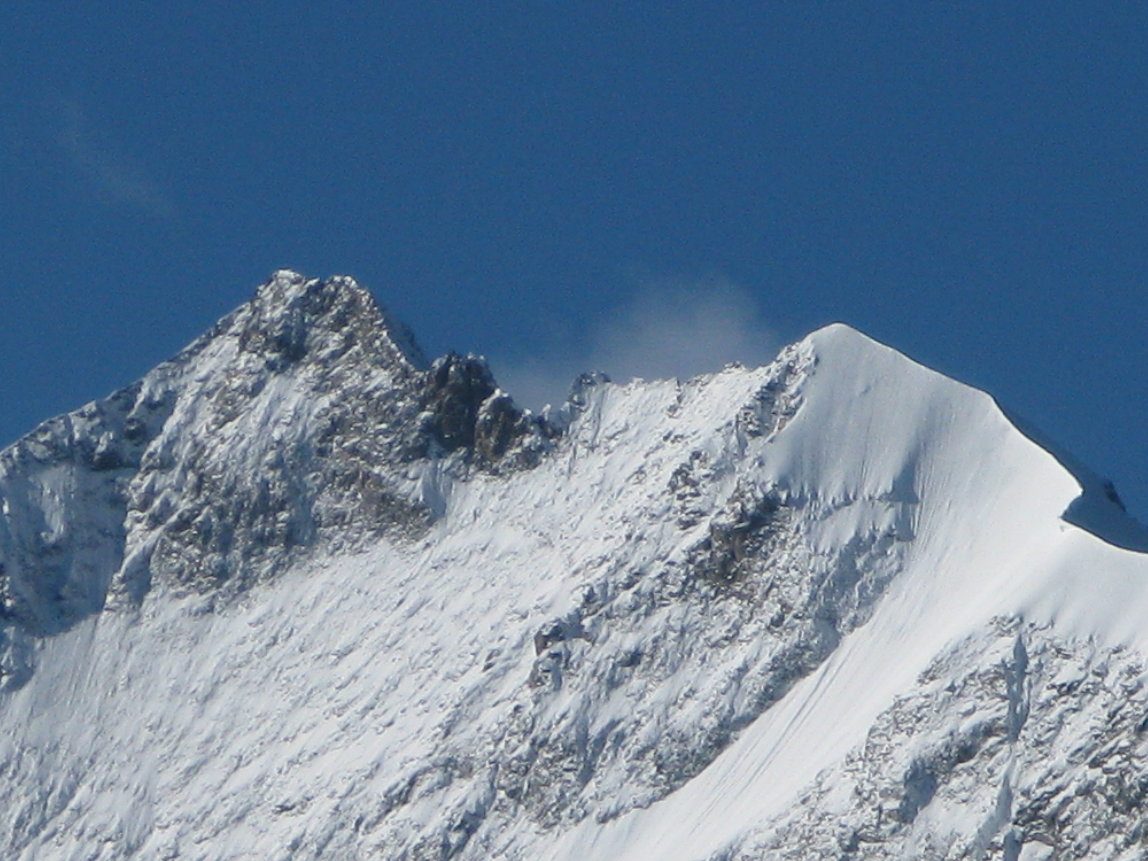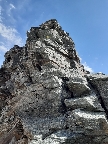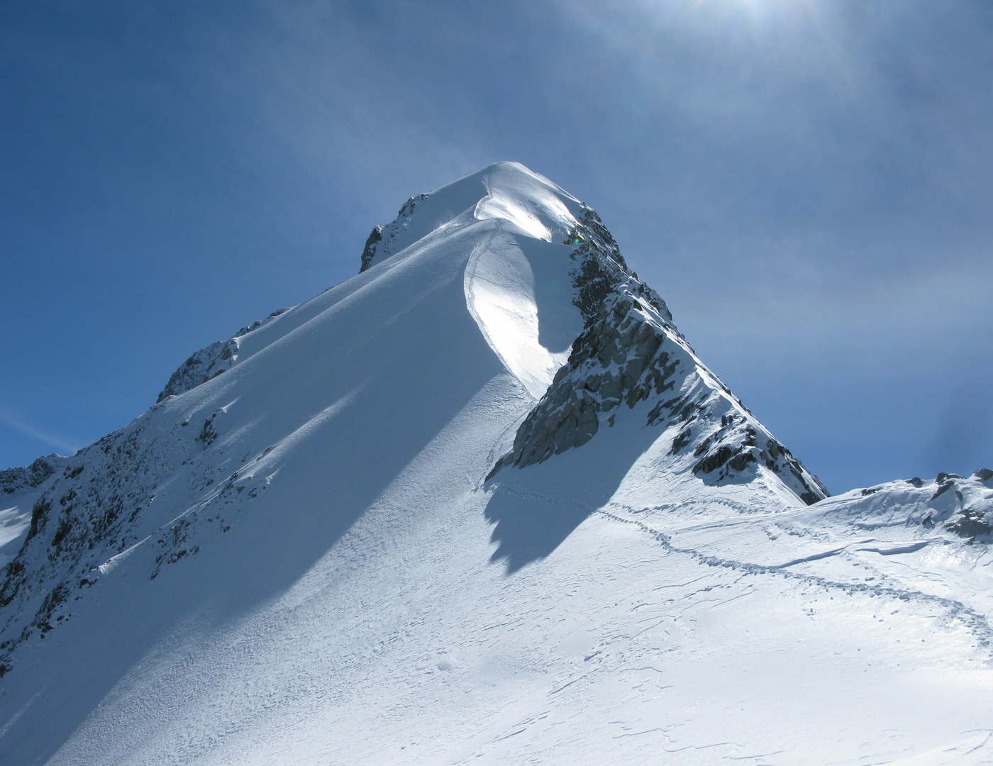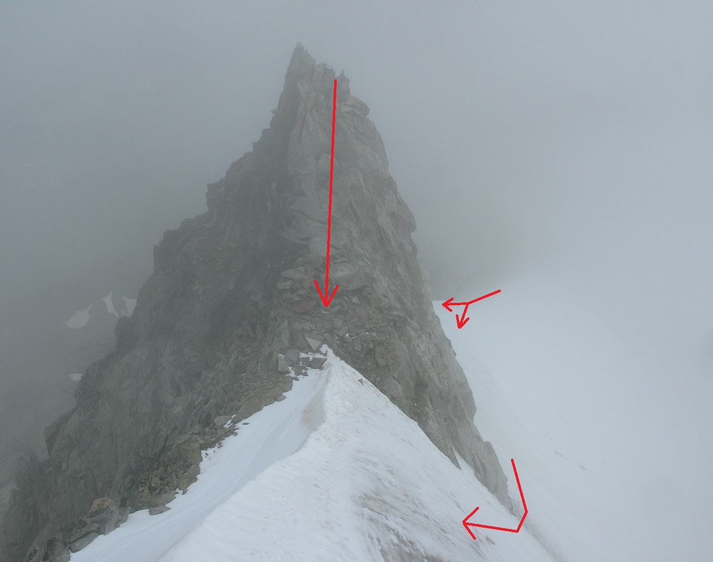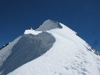 Najrýchlejšia a najpoužívanejšia trasa odbočuje v hornej časti zo skalného hrebeňa vľavo a mierne klesajúcou exponovanou rampou vás privedie na strmý ľadovec (foto). Preistený je aj variant až na koniec skalného hrebeňa, končiaci krátkym zlaňákom. Ten je však určite dlhší. Stretol som tam horských vodcov, ktorí ho akurát zaisťovali s tým, že klientov na ľadovci istiť dobre nemôžu na rozdiel od skalného hrebeňa.