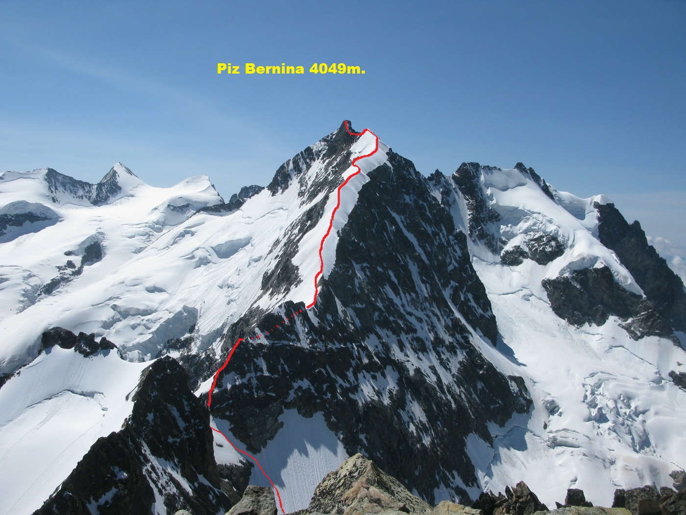 Piz Bernina (4049m) je najvýchodnejšou štvortisícovkou, najvyšším vrcholom tzv. Berninských Álp a zároveň aj najvyšším vrcholom a jedinou štvortisícovkou Východných Álp. Nachádza sa v juhovýchodnom Švajčiarsku na hraniciach s Talianskom. Najľahší výstup na vrchol vedie hrebeňom Spalla (obtiažnosť II., PD). Na tento hrebeň sa dá dostať z talianskej a rovnako aj zo švajčiarskej strany. K výstupu je hojne využívaná chata Marco e Rosa (3609m.) Zo švajčiarskej strany vedie prístupová cesta skalným hrebeňom Fortezzagrat a potom ľadovcovým balkónom Bellavista. Táto trasa nie je obzvlášť technicky náročná (II. UIAA), problémom je dĺžka a prechod ľadovcom s trhlinami.
