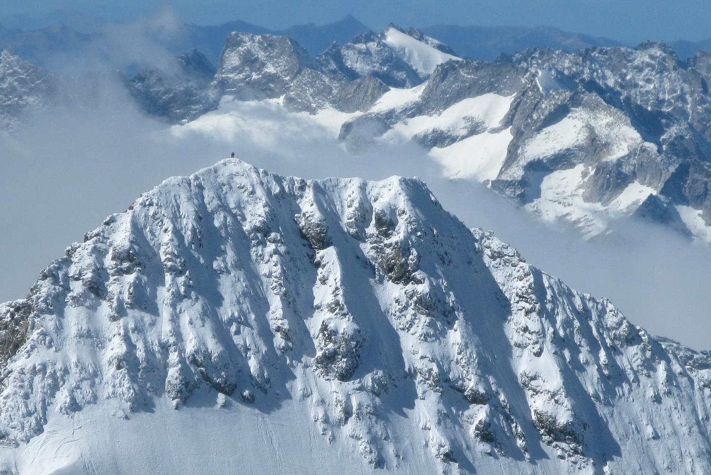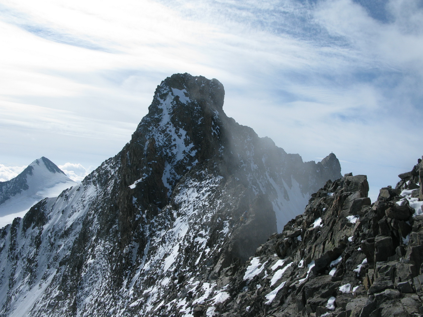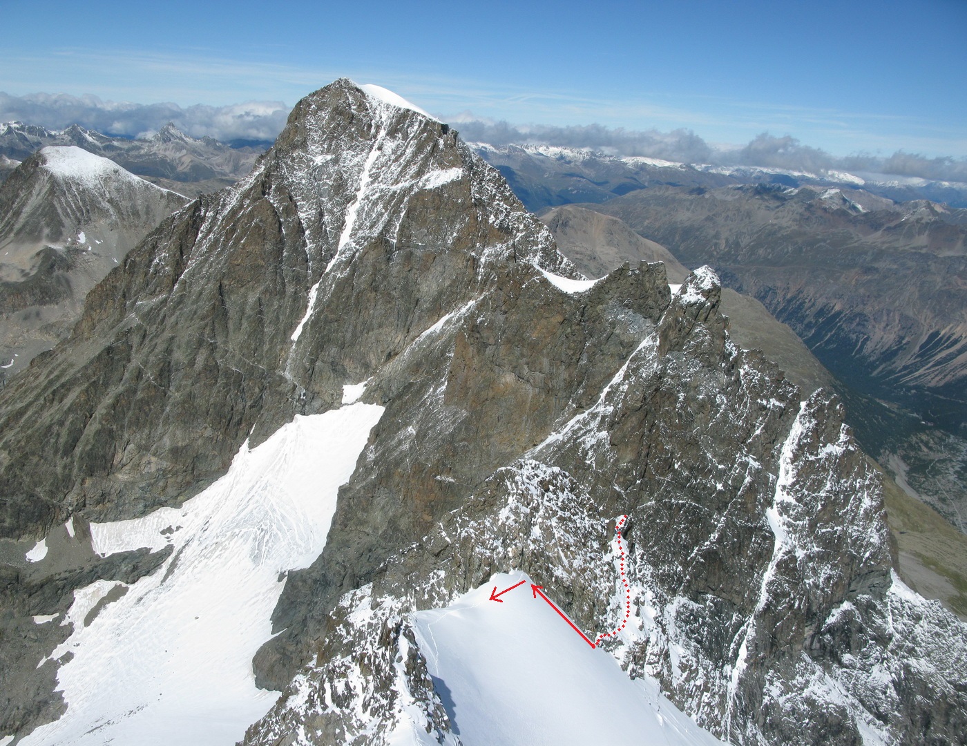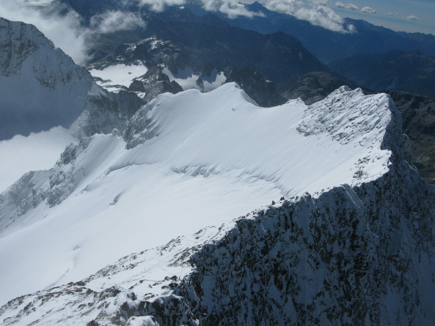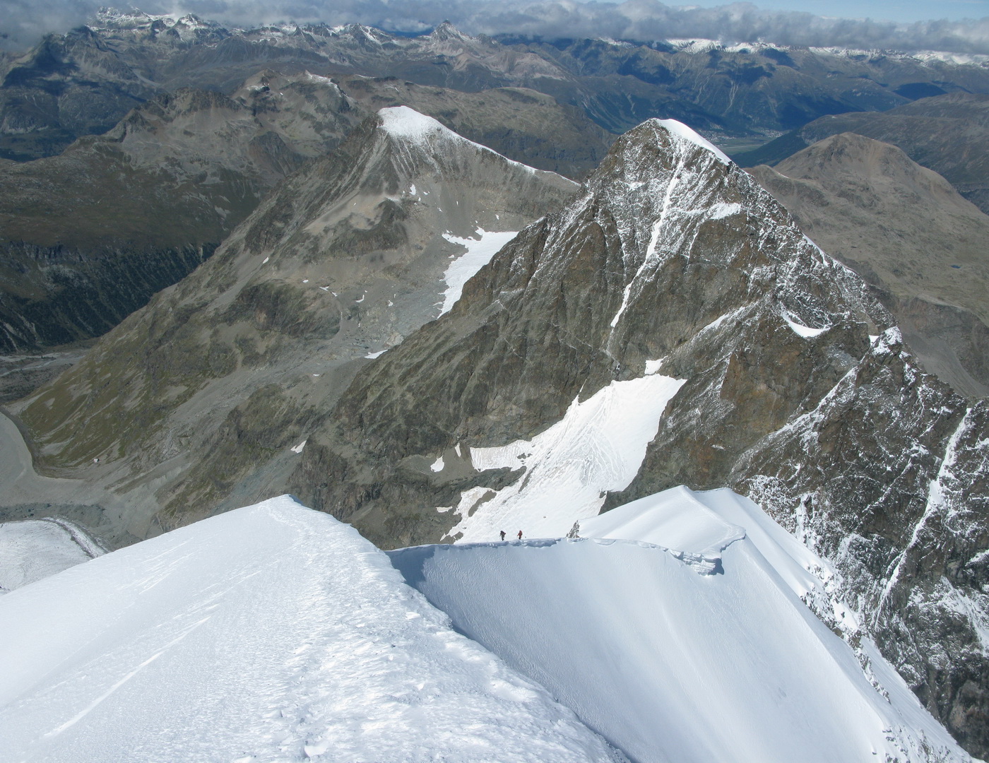 Vychádzam na Piz Bianco (3995m). Mraky sa roztrhali a postupne miznú. Vietor však neustáva.