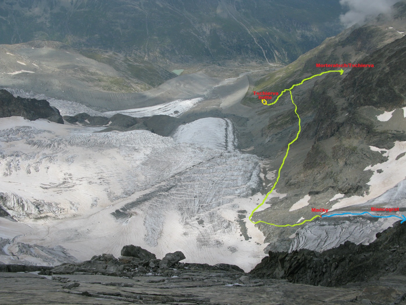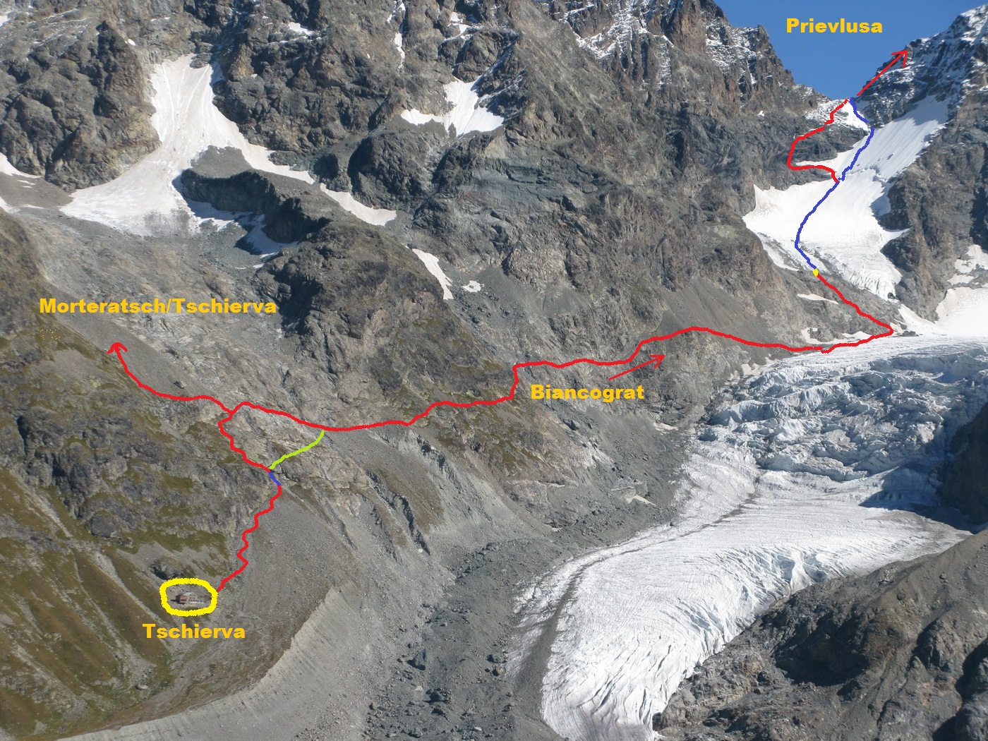 Z tejto chaty vyráža drvivá väčšina záujemcov o tento výstup. Zvykne sa nastupovať skoro ráno, ešte za tmy. Po zosuve pôdy bol chodníček presmerovaný v traverze úpätia Morteratschu trochu vyššie. Chodník je značený skalnými mužíkmi, na začiatku aj farebným značením (bielo-červená), kvôli lepšej orientácii v tme sú na kľúčových miestach odrazky.