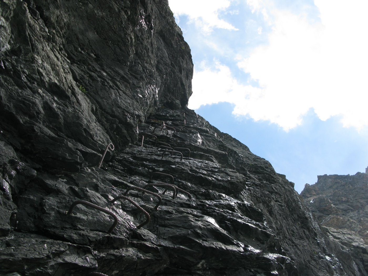 Vyšliapal som strmými serpentínami ku zaistenej skalnej stienke vedľa vodopádu nad chatou. Zopár rýchlych, už nacvičených krokov po železných stupienkoch a schádzam dole z chodníka. Hneď nad reťazami traverzujem cez potok vpravo a pokračujem skratkou: mierne stúpajúcim traverzom v smere výstupu. Na chodník sa pripájam opäť pri ďalšom potoku pod vodopádom. Táto skratka, ktorú som si vymyslel počas mojich prieskumných potuliek, mi ušetrí kopec sily a vari 15 min. času. Nájsť ju však na prvý raz s čelovkou na hlave a za tmy by bol veľký problém a preto ju v sprievodcovi ani neodporúčam.