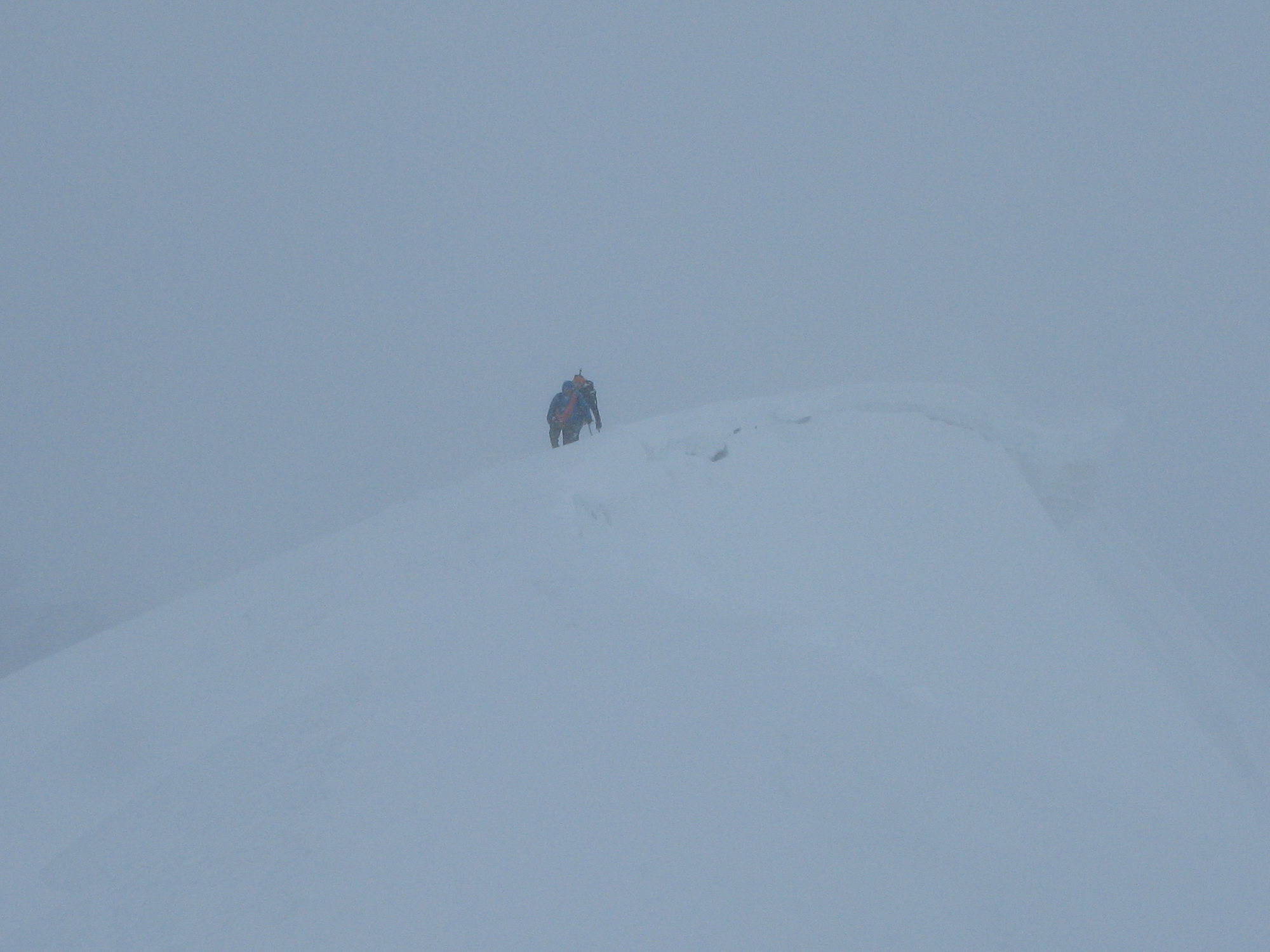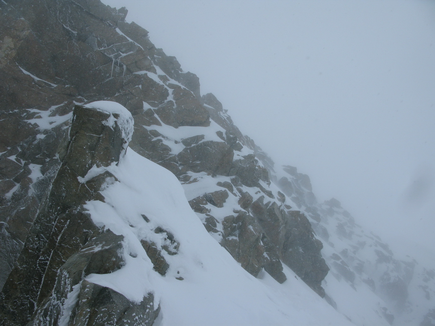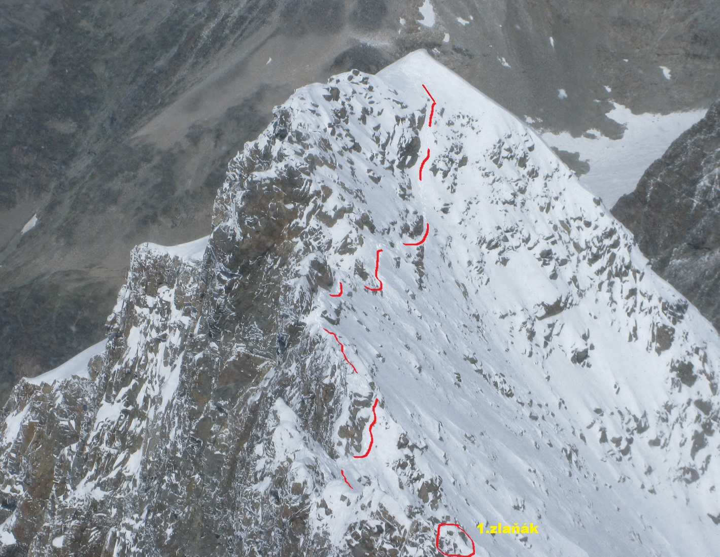 Prichádzam ku hrebeňu, je to stále ťažšie traverzovať ho v týchto podmienkach. Kúsok po hrebeni idem štvornožky. Tu mi boli mačky aj čakany nanič. Pri pohľade vpravo mi nie je moc dobre. Ľavá strana je na tom len o kúsok lepšie.