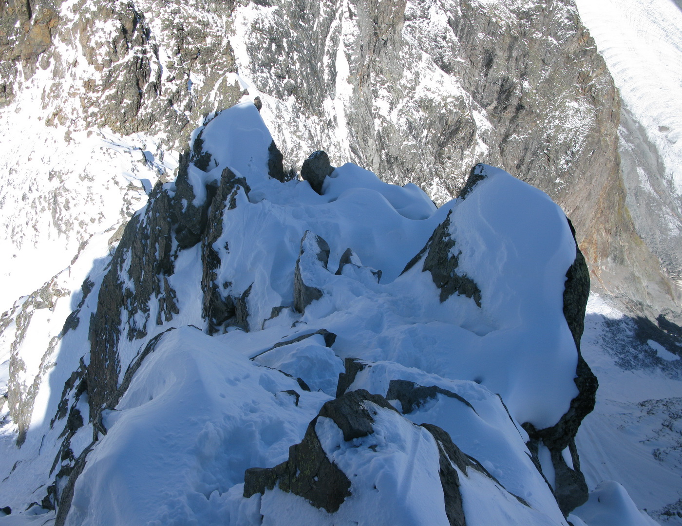 Po krátkej pauze začínam liezť. Traverzujem hrebeň. Snehu je tu veľa, ale nie je dosť tvrdý. Miestami čistý prašan.