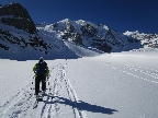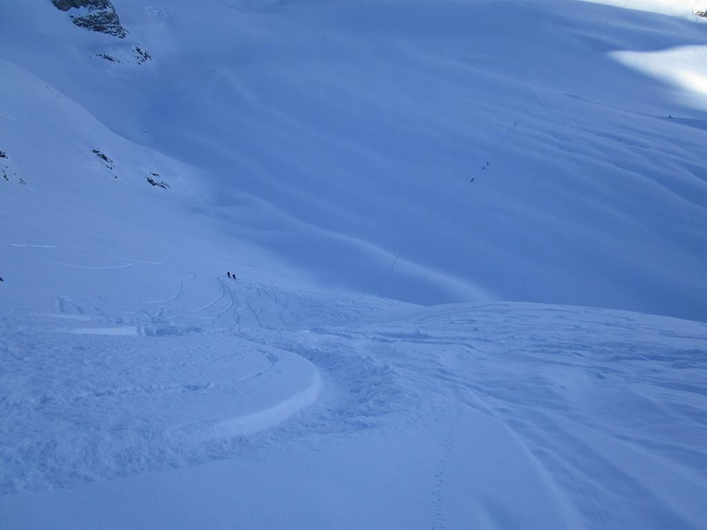 V sedle náš zjazd pozoruje skupina asi 10 ľudí. Keď prídem dole, Mauro je už zabratý do rozhovoru so známym horským vodcom. Po chvíli sa otáča ku mne a ukazuje mi niečo v ruke. Prichádza bližšie: "Vyzbierali sa nám za prešliapanie stopy!" Sa mi zdá, že som zle rozumel, asi žartoval. Uverím mu až keď mi to dole v reštike znovu vysvetľuje a zároveň platí všetko, čo sme skonzumovali. Aj na vláčik nám ostalo...