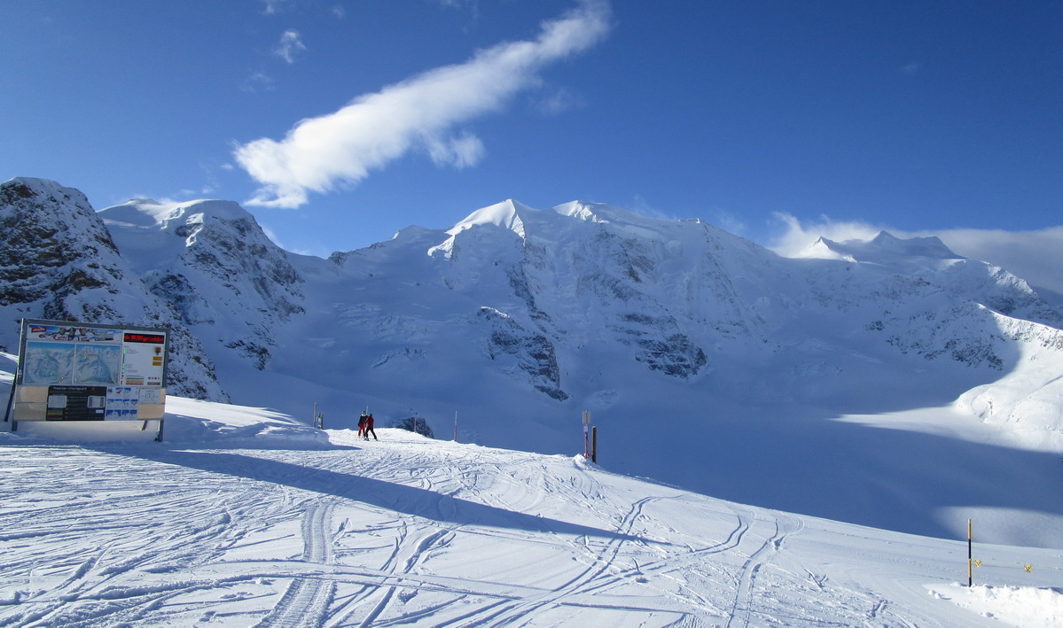 Lanovka na Diavolezzu prekonáva prevýšenie cca 1000 v.m. Z hornej stanice vedie dlhý frírajdový zjazd ľadovcom Morteratsch. Kto chce na Palú, ten po krátkom zjazde ale nalepí pásy a šliape hore opačným smerom.
