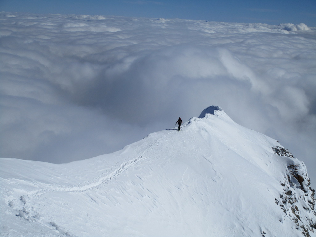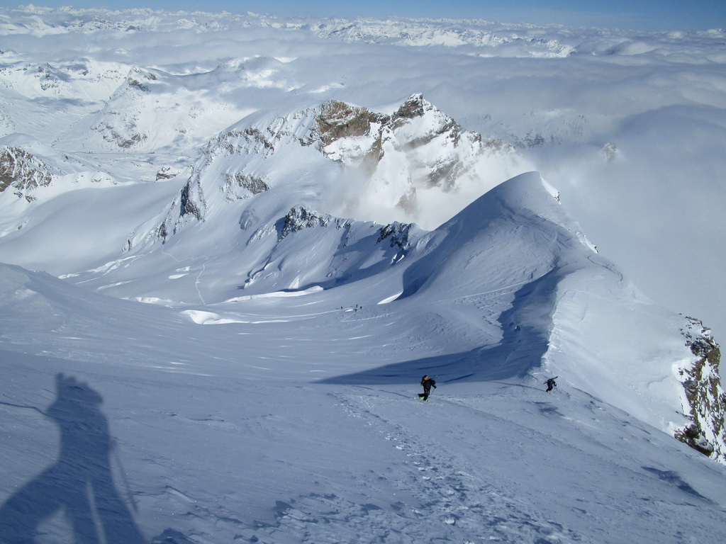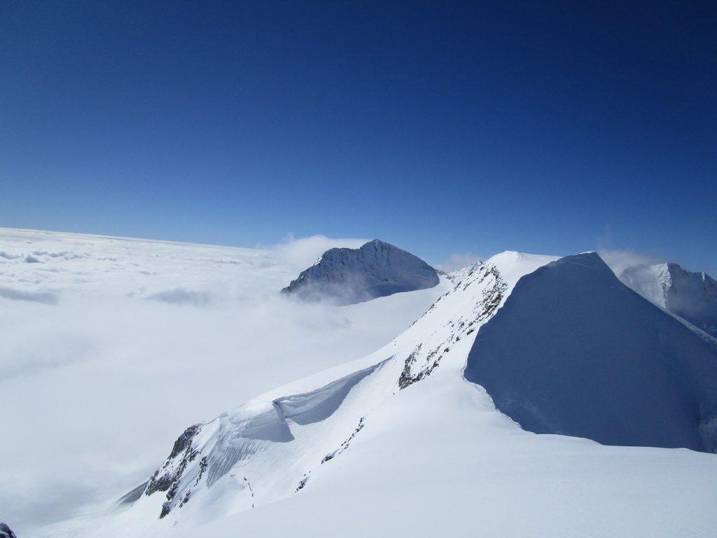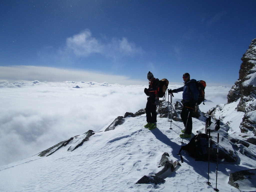 Dvíhajú sa mraky od juhu z talianskych dolín. Keď pôjdeme hore na vrchol riskujeme zjazd v zlej viditeľnosti hovorí Mauro. Mraky sa zastavujú o skalnú hradbu a náš ľadovec ostáva čistý. Poďme hore, vydrží to vravím chlapom, nerád sa otáčam kúsok pod vrcholom v takýchto podmienkach.