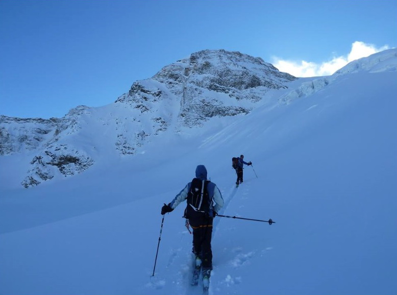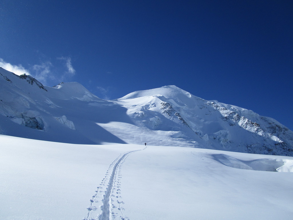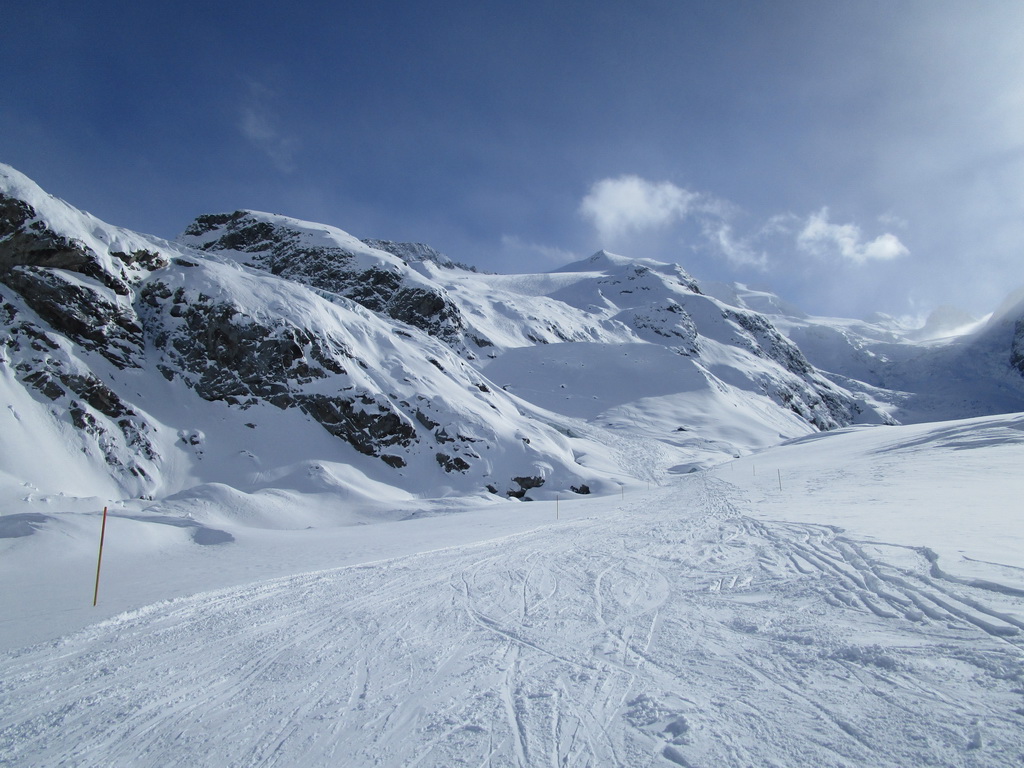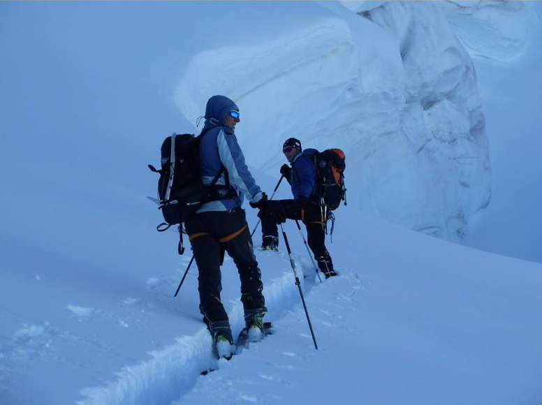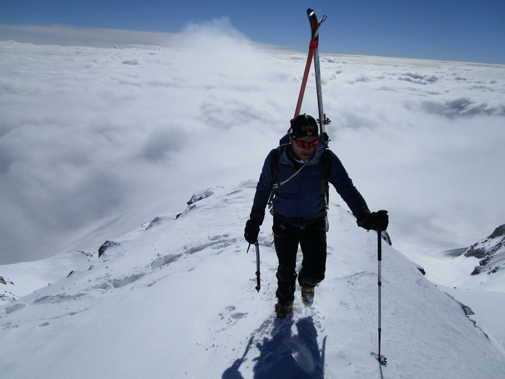 Dvíhajú sa mraky od juhu z talianskych dolín. Keď pôjdeme hore na vrchol riskujeme zjazd v zlej viditeľnosti hovorí Mauro. Mraky sa zastavujú o skalnú hradbu a náš ľadovec ostáva čistý. Poďme hore, vydrží to vravím chlapom, nerád sa otáčam kúsok pod vrcholom v takýchto podmienkach.
