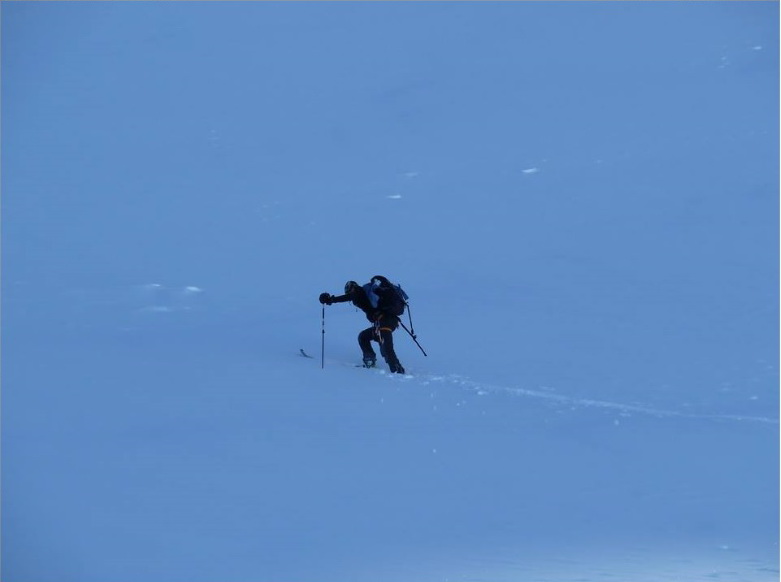 Lyžujeme dole v hlbokom čerstvom prašane, nalepíme pásy a po krátkej chvíli v stope odbočujeme. Miestami pol metra čerstvého snehu. Rozmýšlam, že to máme na dnes teda čo robiť.