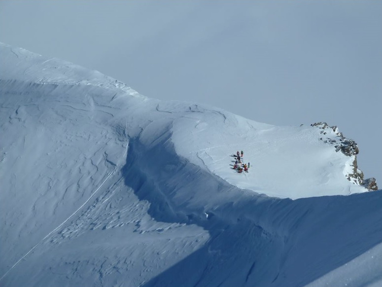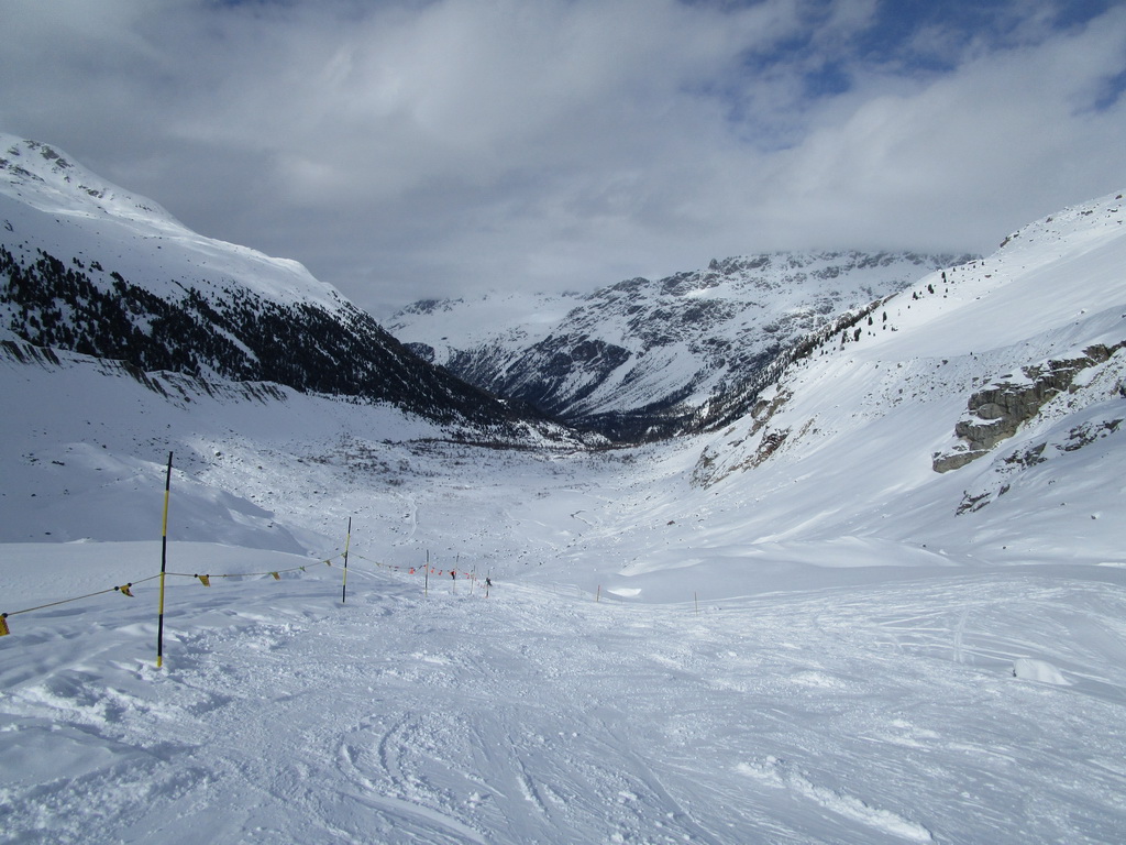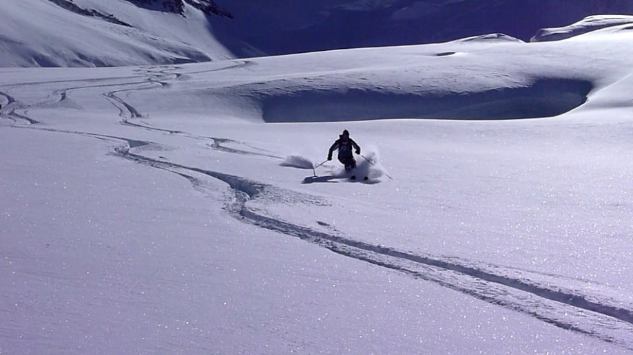 Vystupujeme hore z lanovky, po pár metroch na lyžiach zastavujeme a pozeráme si úžasný výhľad. Neveríme vlastným očiam: žiadna stopa nevedie hore. Nejaké stopy dole traverzujú ľadovec k známej frírajdovej variante Gemsfreiheit ale hore nič.