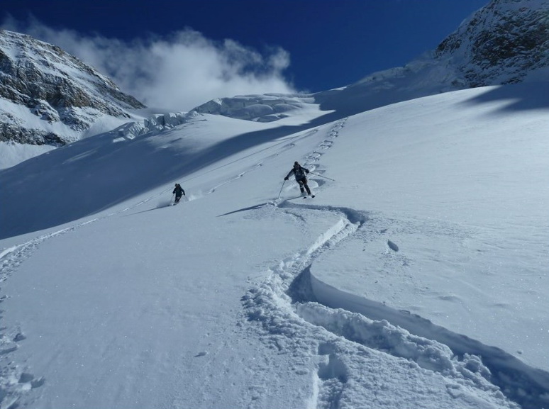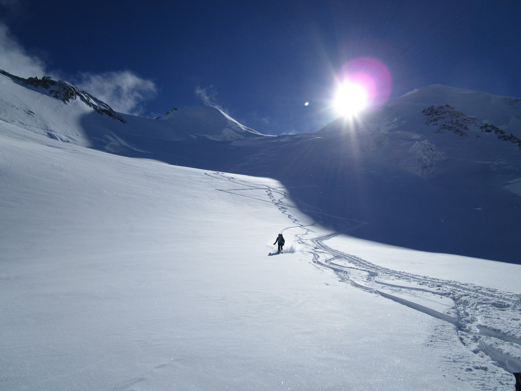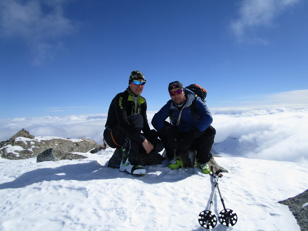 Výhľady z vrcholu sú úžasné. Robíme si navzájom fotky. Mauro lyžuje dole prvý. Cítim, že nemám tú istotu čo on. V ľadovom svahu mi to trvá kým sa odvážim na prvú otočku. Potom to už ide.