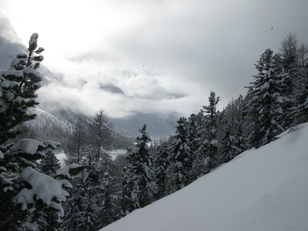 Dolina Val Roseg ponúka pre skialpinistov hlavne vážnejšie ciele až v období stabilnejšej snehovej pokrývky, čiže v druhej polovici zimy. V januári tohto roku, keď sneží takmer každý deň, sa však dá tiež niečo podniknúť. Takou najvďačnejšou túrou do týchto podmienok, keď je všade kopec čerstvého snehu, je stúpanie do sedla Fuorcla Surlej od hotela Roseggletscher. Tu sa nachádza lyžiarska chata, okolo ktorej ide zjazdovka. Tu sa už môžete napojiť na zjazdovku lyžiarskeho strediska Corvatsch a po jej okraji si vyšliapať k vrcholovej stanici lanovky (3300 m).