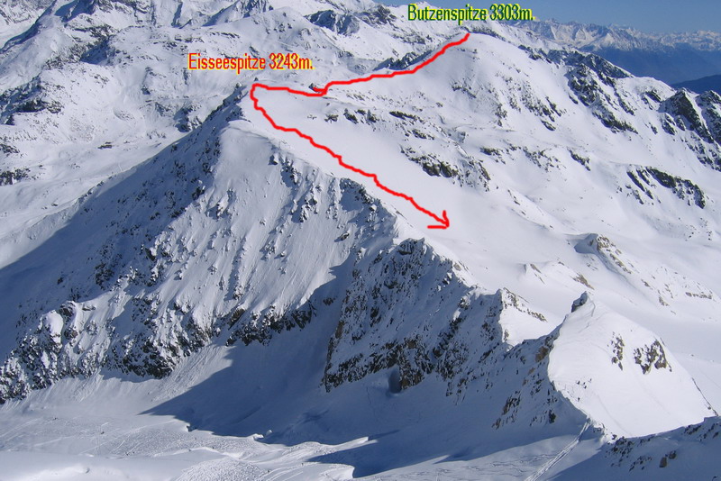 Dnes sa vyberieme na dve trojtisícovky: Butzenspitze (3303m.) a Eisseespitze (3243m.). Obidve sú súčasťou hrebeňa vypínajúceho sa nad lyžiarskym strediskom Madritsch. Z južnej strany majú svahy mierne, kým od Madritschu sa vypínajú strmé skalné steny, popretkávané žlabmi aj nad 40 stupňov. Takže možností neúrekom.