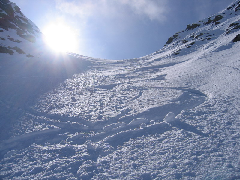 Perfektná lyžovačka by bola smerom do Martelltalu na juhovýchod, ja som sa však ponáhľal do roboty, tak som lyžoval naspäť po mojej stope. V spomínanom žlabe bol ešte prašan, aj keď som za ním musel občas trochu traverzovať (obr.)