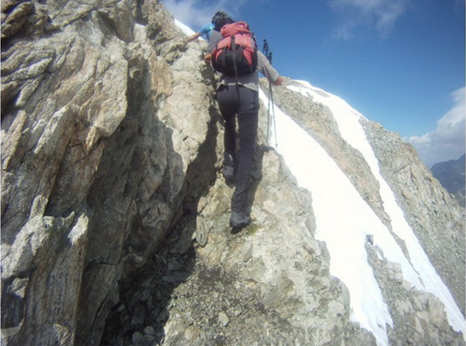 Prvá fáza je výstup cez trávnatý svah až po vodopád, kde začnete mať ten správny vysokohorský pocit. Treba sa držať potoka a širokým kuloárom sa dostanete až k jazeru. Kúsok nad jazerom sa začína (alebo končí) ľadovec. Na prechod ľadovcom za normálnych podmienok netreba žiadnu špeciálnu výbavu, nie sú viditeľné ani trhliny. Cesta nie je značená, ale treba sa cez ľadovec dostať najľahšou cestou na hrebeň, potom odbočiť vpravo a už si len vychutnávať vzdušné pohľady na skalné zrázy, ktoré sú aj niekoľko 100m hlboké.